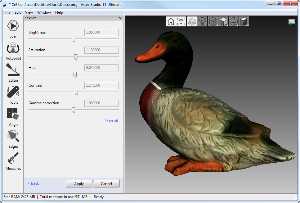 - Adjust the texture brightness in Preview mode by using the eponymous slider in the Scan panel.