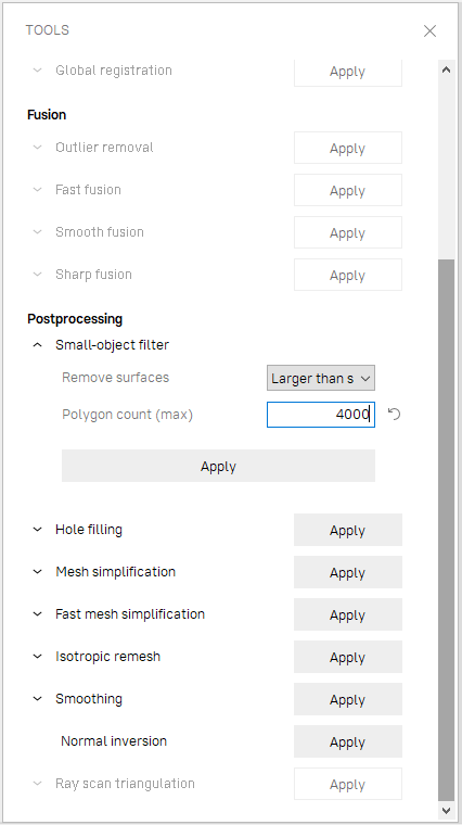 Keep in mind that the algorithms run in the order in which they are listed, starting with Rough serial registration and ending with Isotropic remesh. Thus, if you want to run the Small-object filter before Fast fusion or Global registration, for instance, you must do so manually.