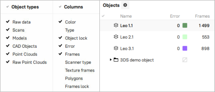 Displays detailed information for 3D objects. / Displays information about captured targets for scans with global registration applied. |